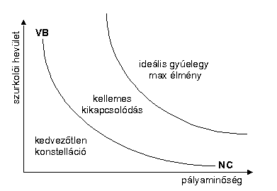 A hangulati ráta végleges képletbe formálása elõtt röviden foglaljuk össze empirikus tapasztalatainkat: a megyeszurkeri értelemben vett pályaminõség legmagasabb és legalacsonyabb értéke között nem lineárisan skálázható a szurkolói hangulat. A nézõk részérõl hozott lelkesedésnek a hely adottságaival összevetett mértéke adja ki az egy köbméterre jutó szurkolói hevületet. Ennek azonban egy elviselhetõségi felsõérték szab határt, optimumát tehát egy bizonyos értéknél találjuk. Hívjuk ezt a hangulati ráta para-agora viselkedésének, ami példával érzékeltetve azt jelenti, hogy egy Nou Camp méretû és felszereltségû stadionban egy Izsák-Akasztó meccs (lásd az ábrán az NC pozíciót) körülbelül ugyanannyira nem tud hangulatban kiteljesedni, amiképpen a VB-döntõ sem lenne élvezhetõ a zalaszentgróti arénában (lásd a VB pontot az ábrán). Azaz, a maga nemében hasonló skálaértékeket kell felvegyen mind a pályaminõség, mind a nézõi lelkesedés összetevõinek részfaktorai ahhoz, hogy maximális hangulat alakuljon ki. Egy hevenyészett kétdimenziós ábrán ez eképpen jeleníthetõ meg: